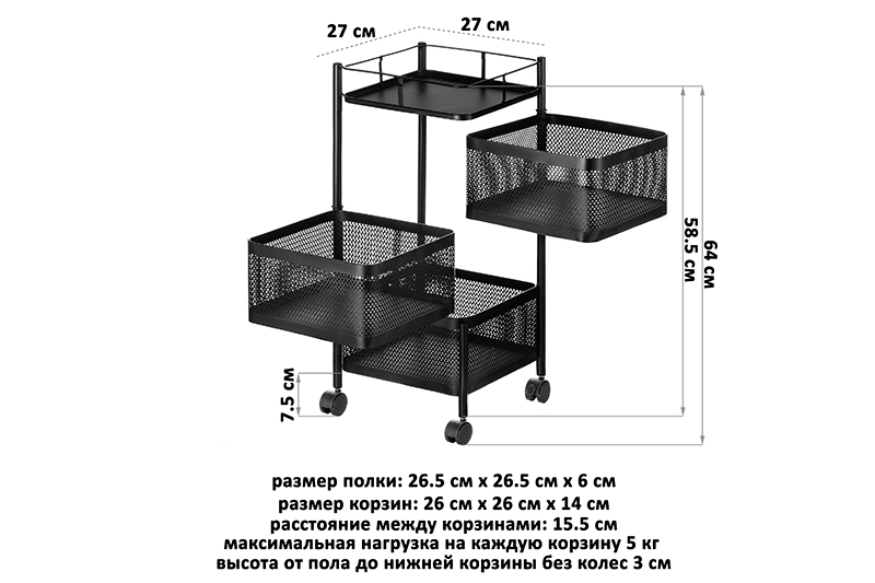Трёхъярусная этажерка ELCASA "Чёрная" размером 27х27х64 см на 4 колесах поможет организовать систему хранения в доме. Выполнена из металла с пудровым покрытием. Размеры верхней полки 26,5х26,5х6 см, каждого прямоугольного ящичка – 26х26х14 см, расстояние между ящиками – 2 см. Максимальная нагрузка на 1 полочку – 5 кг. Высота от пола до нижней корзины без колес 3 см, с колесами – 7,5 см. Квадратные отсеки вращаются по кругу и имеют декоративные отверстия в стеночках. Дно каждой корзины представляет собой гладкую поверхность без отверстий: можно устойчиво расположить лаки для ногтей, косметику, расчёски и другие парикмахерские и маникюрные принадлежности. Благодаря колесикам стеллаж с полочками удобно перемещать из одной комнаты в другую. Система тормоза в виде фиксаторов на 2 колесах позволит устойчиво закрепить положение этажерки в нужном месте. Мебель имеет универсальный дизайн, подойдёт к интерьеру в любом стиле. Мобильную этажерку с корзинками можно использовать для хранения вещей в комнате, на кухне и даже в детской. В прихожей можно положить в неё аксессуары: шапки, перчатки и шарфы. Передвижная этажерка с ящиками будет незаменима в гардеробной или на балконе в роли тумбы. На кухне можно использовать её для хранения овощей и фруктов. Декоративные дырочки на стенках позволяют воздуху проникать внутрь и не дадут продуктам испортиться от недостатка кислорода. В ванной подойдёт для хранения косметичек, бытовой химии или полотенец. Просто поставьте её возле раковины или стиральной машинки. В комнате в неё можно сложить канцелярию или игрушки, используя как маленький шкафчик. В спальне послужит оригинальным туалетным столиком для баночек с косметикой, также пригодится для этой цели в салоне красоты. Можно использовать как прикроватную тумбочку, поставив на неё растения, лампу или предметы декора. В коллекции бренда ELCASA представлены функциональные органайзеры и другие товары для дома. Выберите вариант на свой вкус для создания комфорта в квартире и на даче.