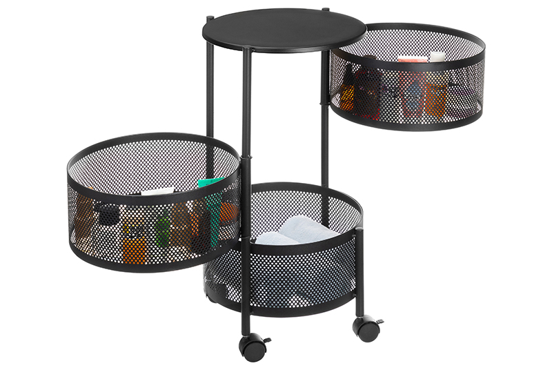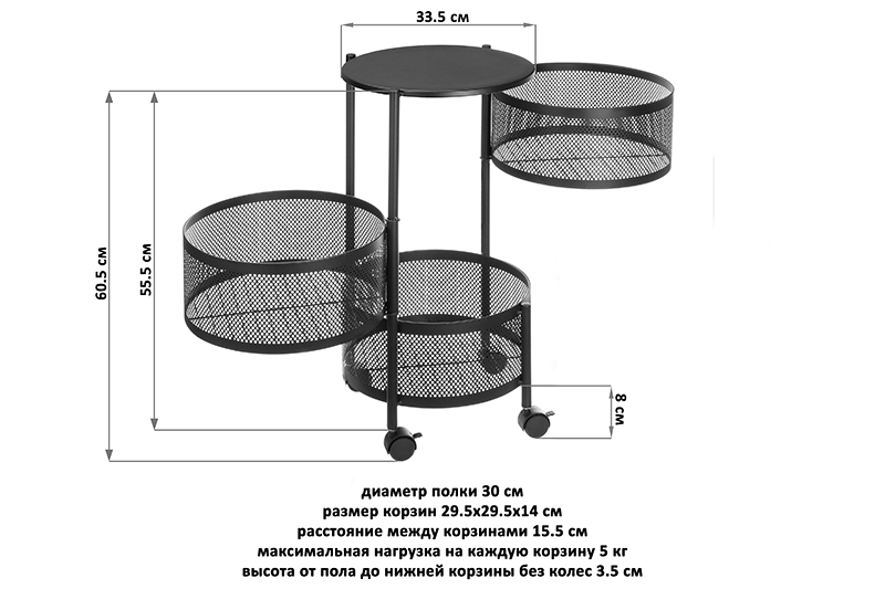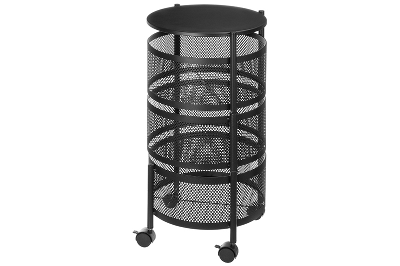 Трёхъярусная этажерка ELCASA "Чёрная" размером 33,5х32х60,5 см на 4 колесах поможет создать порядок и организовать систему хранения в вашем доме. Выполнена из металла. Диаметр каждого круглого ящичка – 30 см, размер – 29,5х29,5х14 см, расстояние между ящиками – 15,5 см. Максимальная нагрузка на одну полочку – 5 кг. Высота от пола до нижней корзины без колес 3,5 см, с колесами – 6,5 см. Отсеки вращаются по кругу и имеют дно в виде металлической сетки. Благодаря колесикам стеллаж с полочками удобно перемещать из одной комнаты в другую. Система тормоза в виде фиксаторов на 2 колесах позволит устойчиво закрепить положение этажерки в нужном месте. Мебель имеет универсальный дизайн, подойдёт к интерьеру в любом стиле. Мобильную этажерку с корзинками можно использовать для хранения вещей в комнате, на кухне и даже в детской. В прихожей можно положить в неё аксессуары: шапки, перчатки, шарфы и зонтики. Подойдёт в роли обувницы для обуви и тапочек. Высокая этажерка с ящиками будет незаменима в гардеробной или на балконе в роли тумбы. На кухне можно использовать её для хранения овощей и фруктов. Каждая корзина может быть использована под разные фрукты и овощи. Декоративные отверстия на стенках позволяют воздуху проникать внутрь и не дадут продуктам испортиться от недостатка кислорода. В ванной подойдёт для хранения косметичек, бытовой химии или полотенец. Просто поставьте её возле раковины или стиральной машинки. В комнате в неё можно сложить книги или игрушки, используя как маленький шкафчик. В спальне послужит оригинальным туалетным столиком для баночек с косметикой. Можно использовать как прикроватную тумбочку, поставив на неё растения, лампу или предметы декора. В коллекции бренда ELCASA представлены функциональные органайзеры и другие товары для дома. Выберите вариант на свой вкус для создания комфорта в квартире и на даче.
