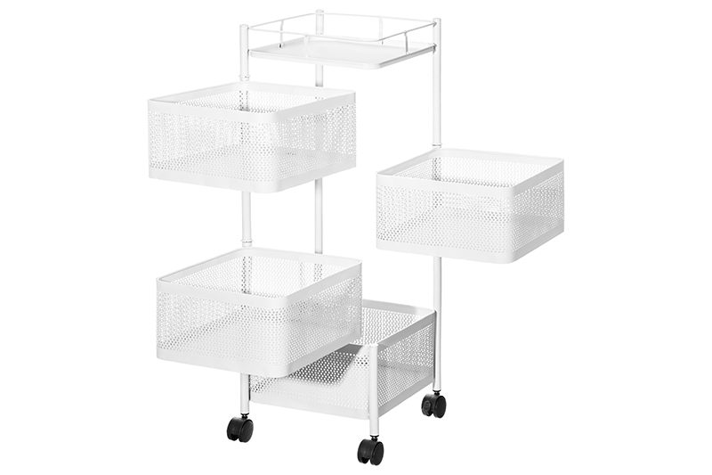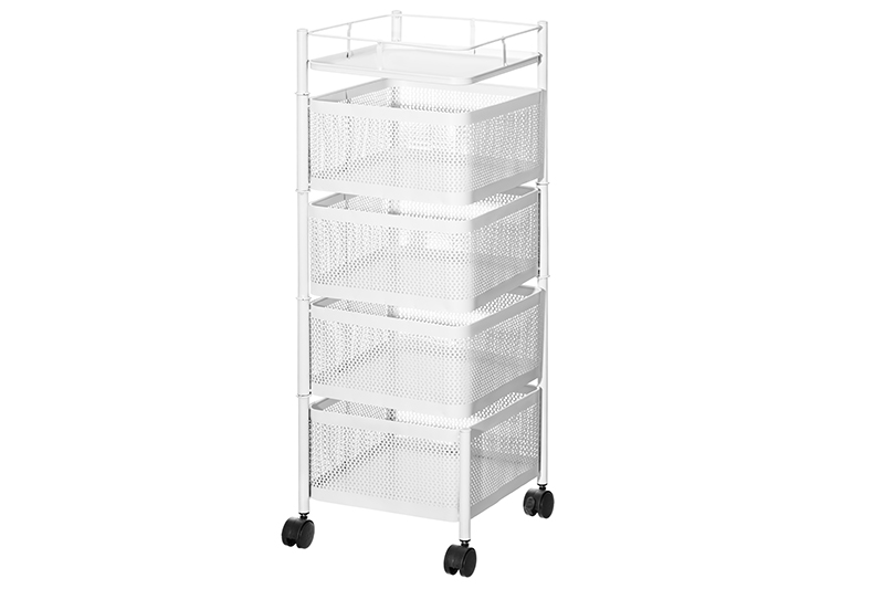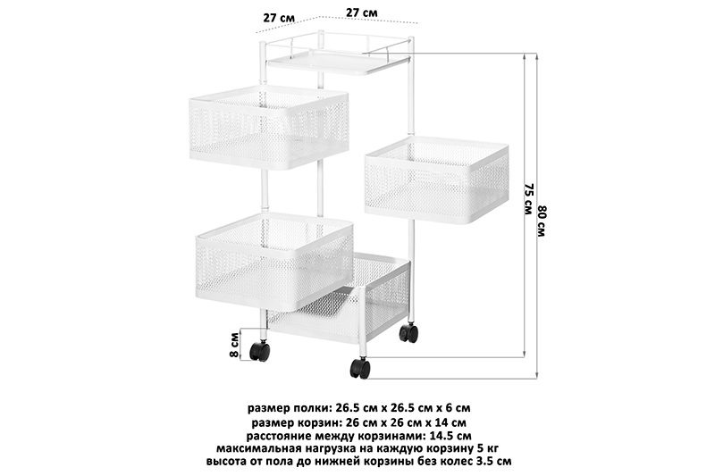 Четырёхъярусная этажерка ELCASA "Белая" размером 27х27х80 см на 4 колесах поможет создать порядок и организовать систему хранения в вашем доме. Размер этажерки без колесиков 27х27х75 см. Выполнена из металла. Размер каждого прямоугольного ящичка – 26х26х14 см, расстояние между ящиками – 2 см. Максимальная нагрузка на одну полочку – 5 кг. Высота от пола до нижней корзины без колес 3 см, с колесами – 7,5 см. Квадратные отсеки вращаются вокруг оси. Благодаря колесикам стеллаж с полочками удобно перемещать из одной комнаты в другую. Система тормоза в виде фиксаторов на 2 колесах позволит устойчиво закрепить положение этажерки в нужном месте. Мебель имеет универсальный дизайн, подойдёт к интерьеру в любом стиле. Мобильную этажерку с корзинками можно использовать для хранения вещей в комнате, на кухне и даже в детской. В прихожей можно положить в неё аксессуары: шапки, перчатки и шарфы. Подойдёт в роли обувницы для обуви и тапочек. Высокая этажерка с ящиками будет незаменима в гардеробной или на балконе в роли тумбы. На кухне можно использовать её для хранения овощей и фруктов. Каждая корзина может быть использована под разные фрукты и овощи. Декоративные отверстия на стенках позволяют воздуху проникать внутрь и не дадут продуктам испортиться от недостатка кислорода. В ванной подойдёт для хранения косметичек, бытовой химии или полотенец. Просто поставьте её возле раковины или стиральной машинки. В комнате в неё можно сложить книги, записные книжки или игрушки, используя как маленький шкафчик. В спальне послужит оригинальным туалетным столиком для баночек с косметикой. Можно использовать как прикроватную тумбочку, поставив на неё растения, лампу или предметы декора. В коллекции бренда ELCASA представлены функциональные органайзеры и другие товары для дома. Выберите вариант на свой вкус для создания комфорта в квартире и на даче.