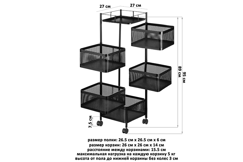 Пятиярусная этажерка ELCASA "Чёрная" размером 27х27х95 см на 4 колесах поможет организовать систему хранения в доме. Выполнена из металла с пудровым покрытием. Размеры верхней полки 26,5х26,5х6 см, каждого прямоугольного ящичка – 26х26х14 см, расстояние между ящиками – 2 см. Максимальная нагрузка на 1 полочку – 5 кг. Высота от пола до нижней корзины без колес 3 см, с колесами – 7,5 см. Квадратные отсеки вращаются по кругу и имеют декоративные отверстия в стеночках. Дно каждой корзины представляет собой гладкую поверхность без отверстий: можно устойчиво расположить лаки для ногтей, косметику, расчёски и другие парикмахерские и маникюрные принадлежности. Благодаря колесикам стеллаж с полочками удобно перемещать из одной комнаты в другую. Система тормоза в виде фиксаторов на 2 колесах позволит устойчиво закрепить положение этажерки в нужном месте. Мебель имеет универсальный дизайн, подойдёт к интерьеру в любом стиле. Мобильную этажерку с корзинками можно использовать для хранения вещей в комнате, на кухне и даже в детской. В прихожей можно положить в неё аксессуары: шапки, перчатки и шарфы. Передвижная этажерка с ящиками будет незаменима в гардеробной или на балконе в роли тумбы. На кухне можно использовать её для хранения овощей и фруктов. Декоративные дырочки на стенках позволяют воздуху проникать внутрь и не дадут продуктам испортиться от недостатка кислорода. В ванной подойдёт для хранения косметичек, бытовой химии или полотенец. Просто поставьте её возле раковины или стиральной машинки. В комнате в неё можно сложить канцелярию или игрушки, используя как маленький шкафчик. В спальне послужит оригинальным туалетным столиком для баночек с косметикой, также пригодится для этой цели в салоне красоты. Можно использовать как прикроватную тумбочку, поставив на неё растения, лампу или предметы декора. В коллекции бренда ELCASA представлены функциональные органайзеры и другие товары для дома. Выберите вариант на свой вкус для создания комфорта в квартире и на даче.
