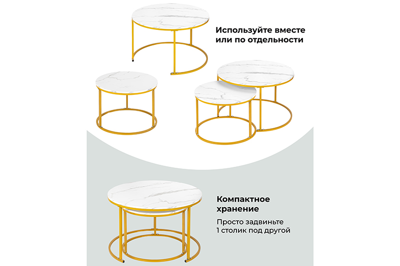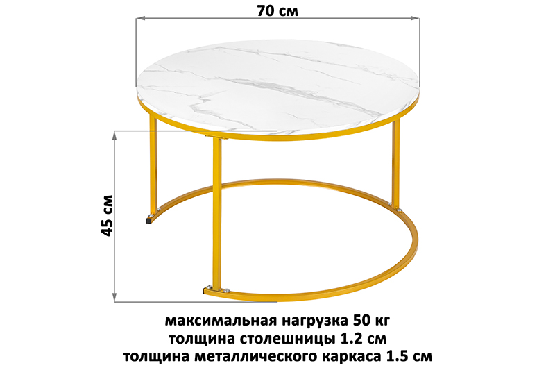 Журнальный столик бренда El Casa размерами 70х70х45 см отлично впишется в любой интерьер. Круглый столик с покрытием под мрамор с золотистыми металлическими ножками - идеальное сочетание элегантности и функциональности. Столешница стола матовая. Мраморный верх привлекает внимание своей природной красотой и уникальными текстурными узорами. Каждый экземпляр является особенным благодаря вариациям в рисунках мрамора. Круглая форма придает столу мягкие и изящные линии, делая мебель безопасной и удобной в использовании. Золотистые ножки гармонично сочетаются с белым мрамором, подчеркивая изысканный дизайн столика. Благодаря прикроватной высоте стола, на нем удобно размещать книги, часы, мобильный телефон. Стол подойдет для работы с ноутбуком или планшетом. Этот столик будет прекрасным местом в вашей гостиной или офисе для размещения журналов, книг, чашек с чаем, цветов и прочих предметов. Журнальный столик из белого мрамора поможет добавить уюта и украсить ваш дом или офис элегантной и изысканной мебелью. При попадании воды и влаги на поверхность столешницы, протрите ее сухой мягкой тканью. Не рекомендуем ставить горячие блюда и напитки. Избегайте воздействия на мебель абразивных моющих средств. Данный столик можно дополнить журнальным столом меньших размеров из этой же коллекции. Сочетание двух столов в едином скандинавском стиле однозначно станет объектом внимания. Журнальный столик из белого мрамора серии El Casa - прекрасный выбор для подарка на свадьбу, новоселье, день рождения.