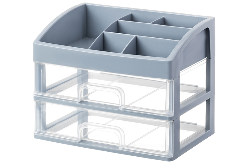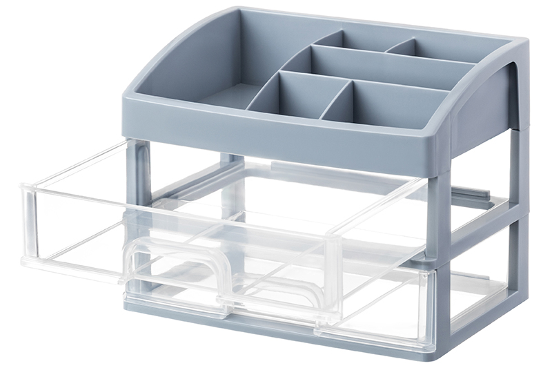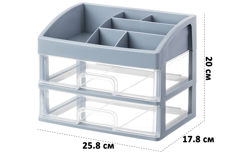 Настольный органайзер от ELCASA станет универсальным решением для хранения самых разнообразных мелочей. Размер изделия – 25,8х17,8х20 см, внутренний размер каждого ящичка по дну – 23х16,5х5,5 см. Имеет 2 выдвижных ящика и верхнюю секцию с 6 отделениями разных размеров. Выполнен из полипропилена – прочного пищевого пластика, не содержащего бисфенол А и не выделяющего вредные вещества. Благодаря этому пластиковый контейнер подойдёт для хранения уходовой и декоративной косметики, а также косметических и маникюрных принадлежностей. Разместите по отсекам лаки, пилочки, кисточки, пинцеты, ватные диски, палочки и другие аксессуары, чтобы они всегда были под рукой. Бокс найдёт своё место и в других частях вашего дома. В спальне заполните его для хранения резинок, заколок или украшений, в прихожей используйте для ключей. Безопасный пластик в составе позволяет использовать его как аптечку для хранения и сортировки лекарств. Съёмное верхнее отделение с ячейками послужит в качестве самостоятельного органайзера. Поставьте его на рабочий стол дома или в офисе, чтобы хранить канцелярию, зарядные устройства и флешки. Элегантный серо-синий цвет и прозрачные ящички придают изделию аккуратный и современный вид. Благодаря этому он впишется в любой интерьер. Не рекомендуется применять абразивные моющие средства. Органайзер от бренда ЭЛЬКАСА станет отличным подарком для тех, кто ценит порядок, удобство и эстетику.