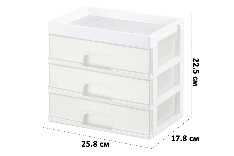 Настольный органайзер от ELCASA белого цвета станет универсальным решением для хранения самых разнообразных мелочей. Размер изделия – 25,8х17,8х22,5 см, внутренний размер каждого ящичка по дну – 23х16,5х5,5 см. Имеет 3 выдвижных ящика и верхнюю секцию с бортиками. Выполнен из полипропилена – прочного пищевого пластика, не содержащего бисфенол А и не выделяющего вредные вещества. Благодаря этому пластиковый контейнер подойдёт для хранения уходовой и декоративной косметики, а также косметических и маникюрных принадлежностей. Разместите по отсекам лаки, пилочки и пинцеты, а также другие аксессуары, чтобы они всегда были под рукой. Бокс найдёт своё место и в других частях вашего дома. В спальне заполните его для хранения резинок, заколок или украшений, в прихожей используйте для ключей. Безопасный пластик в составе позволяет использовать его как аптечку для хранения и сортировки лекарств. Поставьте его на рабочий стол дома или в офисе, чтобы хранить канцелярию, зарядные устройства и флешки. Ящики имеют пурпурный оттенок, что придаёт изделию аккуратный и современный вид. Благодаря универсальному дизайну миниатюрный шкафчик впишется в любой интерьер. Не рекомендуется применять абразивные моющие средства. Органайзер от бренда ЭЛЬКАСА станет отличным подарком для тех, кто ценит порядок, удобство и эстетику.