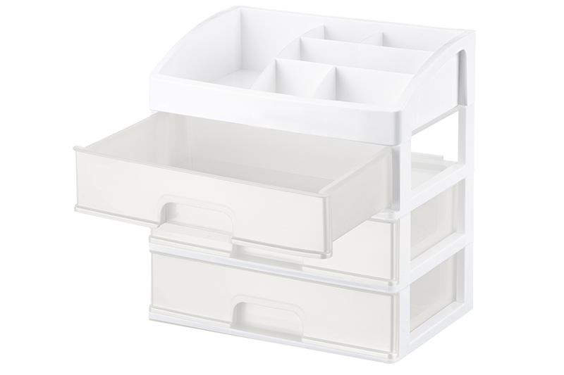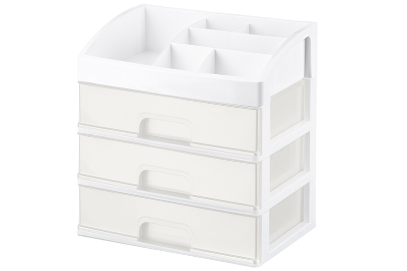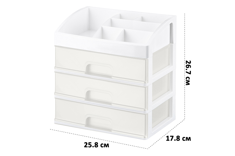 Настольный органайзер от ELCASA станет универсальным решением для хранения самых разнообразных мелочей. Размер изделия – 25,8х17,8х26,7 см, внутренний размер каждого ящичка по дну – 23х16,5х5,5 см. Имеет 3 выдвижных ящика и верхнюю секцию с 6 отделениями разных размеров. Выполнен из полипропилена – прочного пищевого пластика, не содержащего бисфенол А и не выделяющего вредные вещества. Благодаря этому пластиковый контейнер подойдёт для хранения уходовой и декоративной косметики, а также косметических и маникюрных принадлежностей. Разместите по отсекам лаки, пилочки, кисточки, пинцеты, ватные диски, палочки и другие аксессуары, чтобы они всегда были под рукой. Бокс найдёт своё место и в других частях вашего дома. В спальне заполните его для хранения резинок, заколок или украшений, в прихожей используйте для ключей. Безопасный пластик в составе позволяет использовать его как аптечку для хранения и сортировки лекарств. Съёмное верхнее отделение с ячейками послужит в качестве самостоятельного органайзера. Поставьте его на рабочий стол дома или в офисе, чтобы хранить канцелярию, зарядные устройства и флешки. Элегантный белый цвет и нежные перламутровые ящички придают изделию аккуратный и современный вид. Благодаря этому он впишется в любой интерьер. Не рекомендуется применять абразивные моющие средства. Органайзер от бренда ЭЛЬКАСА станет отличным подарком для тех, кто ценит порядок, удобство и эстетику.