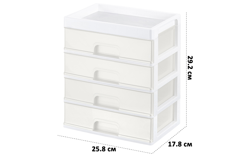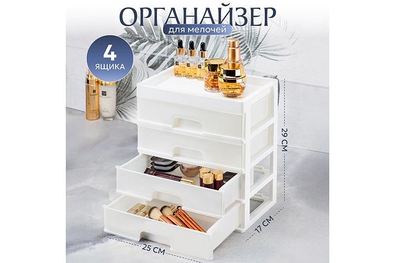 Настольный органайзер от ELCASA белого цвета станет универсальным решением для хранения самых разнообразных мелочей. Размер изделия – 25,8х17,8х29,2 см, внутренний размер каждого ящичка по дну – 23х16,5х5,5 см. Имеет 4 выдвижных ящика и верхнюю секцию с бортиками. Выполнен из полипропилена – прочного пищевого пластика, не содержащего бисфенол А и не выделяющего вредные вещества. Благодаря этому пластиковый контейнер подойдёт для хранения уходовой и декоративной косметики, а также косметических и маникюрных принадлежностей. Разместите по отсекам лаки, пилочки и пинцеты, а также другие аксессуары, чтобы они всегда были под рукой. Бокс найдёт своё место и в других частях вашего дома. В спальне заполните его для хранения резинок, заколок или украшений, в прихожей используйте для ключей. Безопасный пластик в составе позволяет использовать его как аптечку для хранения и сортировки лекарств. Поставьте его на рабочий стол дома или в офисе, чтобы хранить канцелярию, зарядные устройства и флешки. Ящики имеют пурпурный оттенок, что придаёт изделию аккуратный и современный вид. Благодаря универсальному дизайну миниатюрный шкафчик впишется в любой интерьер. Не рекомендуется применять абразивные моющие средства. Органайзер от бренда ЭЛЬКАСА станет отличным подарком для тех, кто ценит порядок, удобство и эстетику.
