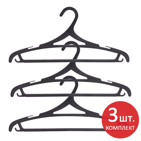 Вешалки-плечики, размер 46-48, КОМПЛЕКТ 3 шт., пластиковые, плоские, перекладина, крючки, черные, ЛЮБАША, 605547