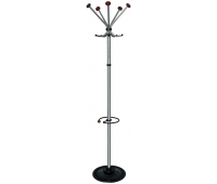 Офисная вешалка напольная на 5 крючков. Снабжена подставкой для зонтов. Утяжеленное двойное основание. Выполнена из оцинкованной стали с полимерным покрытием. Штанга из зеркальной нержавеющей стали. Декоративные наконечники (шары) – натуральное дерево. Поставляется в разобранном виде в картонной таре. Элементы вешалки покрыты защитной полиэтиленовой пленкой.