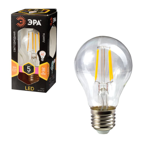 Лампа светодиодная ЭРА, 5 (40) Вт, цоколь E27, грушевидная, теплый белый свет, 30000 ч., F-LED А60-5w-827-E27, 452125