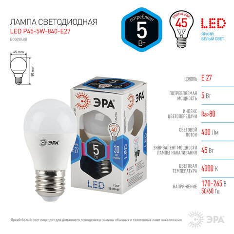 Лампа светодиодная ЭРА, 5 (40) Вт, цоколь E27, шар, холодный белый свет, 30000 ч., LED smdP45-5w-840-E27 452182
