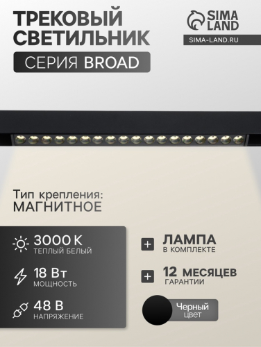 Трековый магнитный светильник, серия Broad LTL-058, 12 Вт, 960 Лм, 48 В, 4000К, чёрный