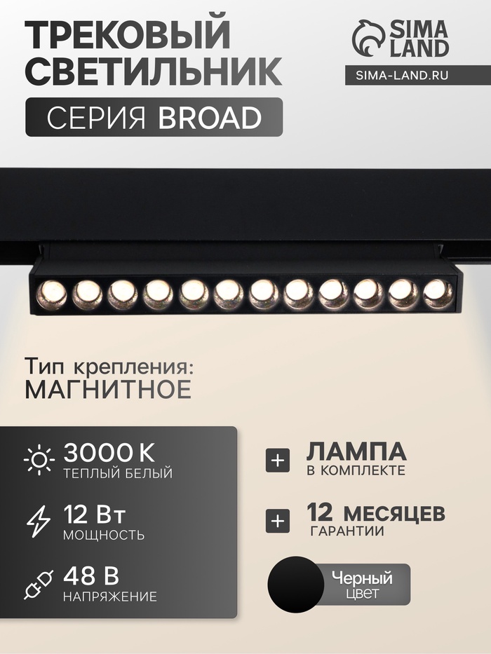 Трековый магнитный светильник, серия Broad LTL-059, 12 Вт, 960 Лм, 48 В, 3000К, чёрный