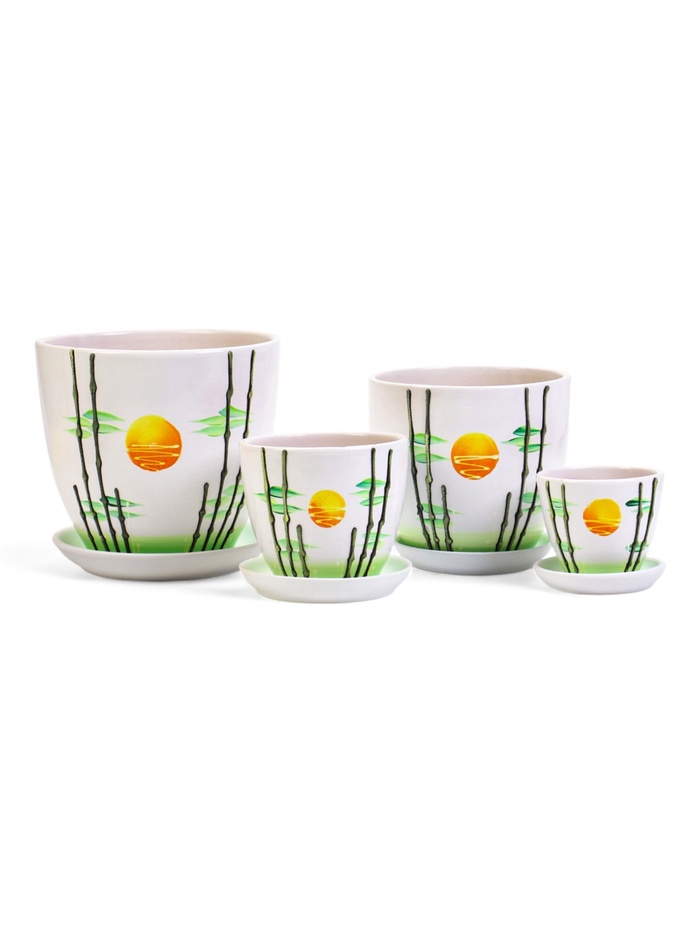 Набор керамических горшков «Азия» — универсальное решение для любителей комнатных растений. В комплекте 4 горшка разных объёмов (0,4 л, 1 л, 2,5 л и 5 л) с поддонами, что позволяет выращивать растения различных размеров. Белоснежная керамика с восточным орнаментом придаёт особый шарм, а качественное исполнение гарантирует долговечность.