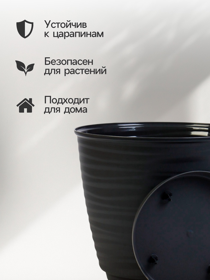 Чёрный пластиковый горшок Saffron с поддоном - стильное и практичное решение для крупных комнатных растений. Объём 9,1 л, диаметр 26,7 см и высота 24,5 см идеально подходят для фикусов, драцен, монстер и других солидных растений. Глубокий чёрный цвет придаст современный акцент вашему интерьеру, а прочный пластик гарантирует долговечность использования.
