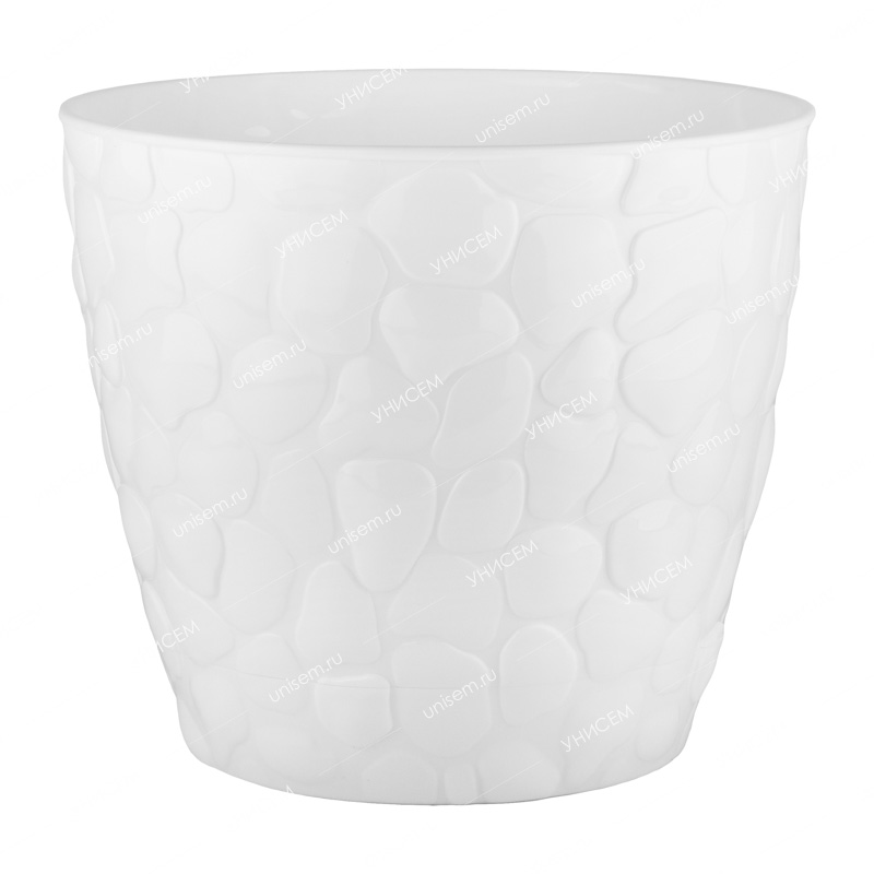 Кашпо «Камни» завоюет сердце любого цветовода! Его стенки украшены объёмной текстурой, имитирующей морскую гальку, что делает это кашпо индивидуальным. Кашпо подходит для выращивания как многолетних, так и однолетних растений и станет последним штрихом в оформлении квартиры, офиса или сада. Изделие выполнено в белом цвете, изготовлено из безопасного и прочного материала – пластика. Данный материал имеет долгий срок службы и легко очищается. Особенность этого горшка в конструкции – пристегивающийся поддон. Он надёжно крепится к горшку, с помощью специальных сильных креплений. Это предотвращает протечку жидкости. А на дне горшка есть специальные дренажные отверстия, обеспечивающие отвод лишней воды и аэрацию воздуха. Объём – 8 литров, диаметр – 26 см.