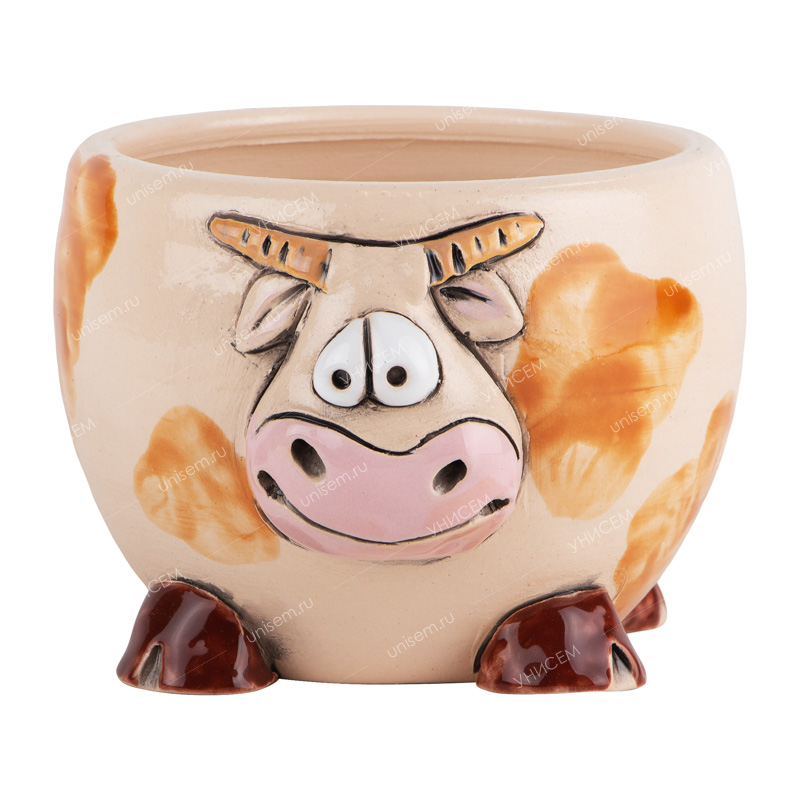 Декоративное керамическое кашпо в форме коровы. Кашпо «Буренка» имеет уникальный и неповторимый дизайн, идеально подойдет для кактусов и суккулентов. Отличие кашпо от горшка – отсутствие у кашпо дренажного отверстия и поддона. Поэтому растение сначала необходимо посадить в небольшой пластиковый горшочек, а потом поставить в кашпо (это защитит от перелива растений и загнивания корней). Кашпо может использоваться не только для посадки растений, но и для хранения разных мелочей или сухоцветов. Объём – 0,6 литров, диаметр – 16 см.