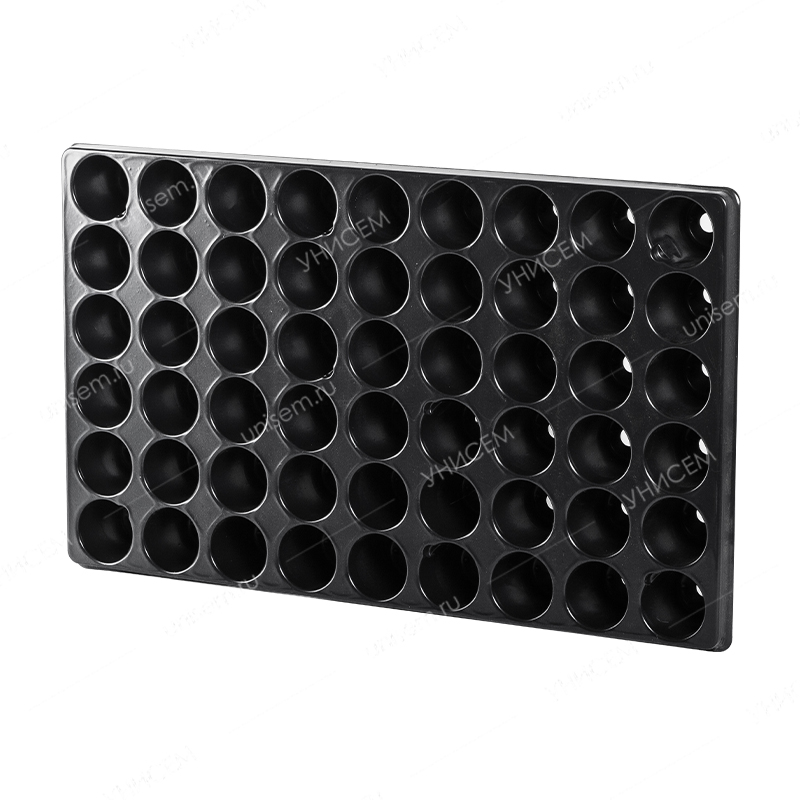 Кассета для рассады используется для рассадки, пересадки посадочного материала и раннего высевания семян. Каждая ячейка объёмом 80 мл предназначена для одного растения, благодаря чему корни не повреждаются при пересаживании. Большое количество ячеек позволяет компактно рассадить сразу несколько различных культур. Всего 54 круглых ячеек. Кассета изготовлена из пластика чёрного цвета, размеры – 52 × 31× 5,5 см.
