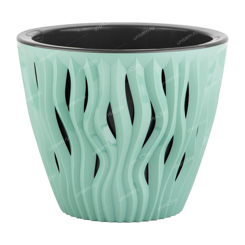 Стильное кашпо «Вдохновение» с объёмной волнообразной текстурой станет украшением любого интерьера – от сдержанного офисного, до уютного домашнего. Кашпо представлены в самых разных объёмах и расцветках, а поэтому подойдут для больших и маленьких растений, простых цветов и сложных флористических композиций. Конструкция предусматривает удобные технологические ручки, которые упрощают пересадку и уход за растением. Состоит из основного декоративного горшка и внутренней вставки с дренажными отверстиями. Наличие такой дренажной вставки обеспечивает отвод воды от грунта и позволяет дышать корневой системе растения. Кашпо окрашено в светло-зелёный цвет, изготовлено из надёжного пластика, благодаря чему отличается прочностью, устойчивостью к ультрафиолету и перепадам температур. Объём – 1,6 литров, диаметр – 16 см.