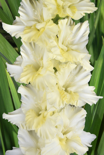 Белый гладиолус с малиновыми пятнышками и салатной бахромой по краям трёх внутренних лепестков. Сильная гофрировка с защипами. Растение мощное, прочный колос высокий 160 см.