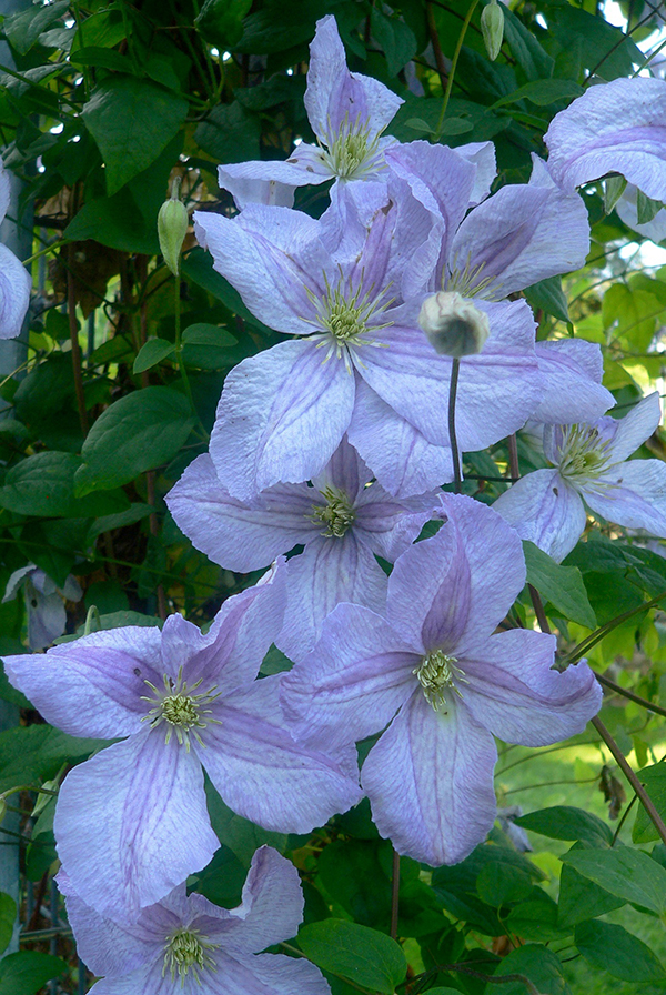 Обильноцветущий сорт с красивыми цветами. Цветки светло-голубые с фиолетовым оттенком и кремовыми тычинками. Может использоваться как почвопокровное и подниматься по натуральным опорам, например большой кустарник или деревья.