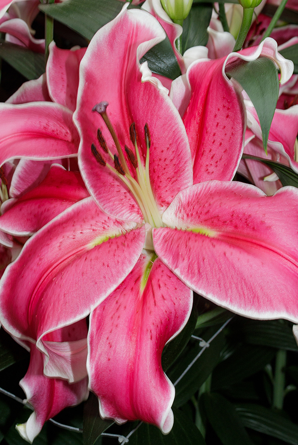 Сорт с крупными цветками элегантной расцветки. Его розовые, в темную крапинку лепестки эффектно обрамлены белой полоской. Цветоносное растение образует крепкий стебель, вырастающий примерно на 1,2 м. На нем располагаются плотно-кожистые, темно-зеленые листья. Лучше всего выращивать в центральном месте вашей клумбы.