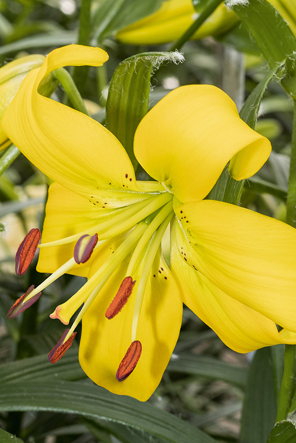 Лилия Перл Мелани поражает своим изяществом и красотой. Ее крупные цветки лимонно-желтого цвета очень эффектно смотрятся в сочетании с темно-зелеными листьями. Цветки воронковидной формы, слегка направлены вниз. Лепестки атласной текстуры, с эффектно подкрученными концами. Цветки появляются на вершине высокого стебля. Они собраны в соцветия по несколько штук. Листья толстые, блестящие, небольшого размера и насыщенно-зеленого окраса. Отличается очень высокой морозостойкостью.