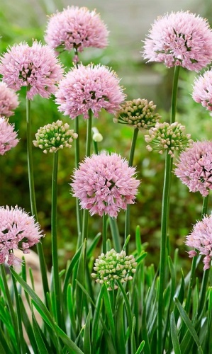 Соцветия округлые, диаметром до 4 см. Цветки светло-розово-лавандовые, красиво выгорают до кремово-белых.
