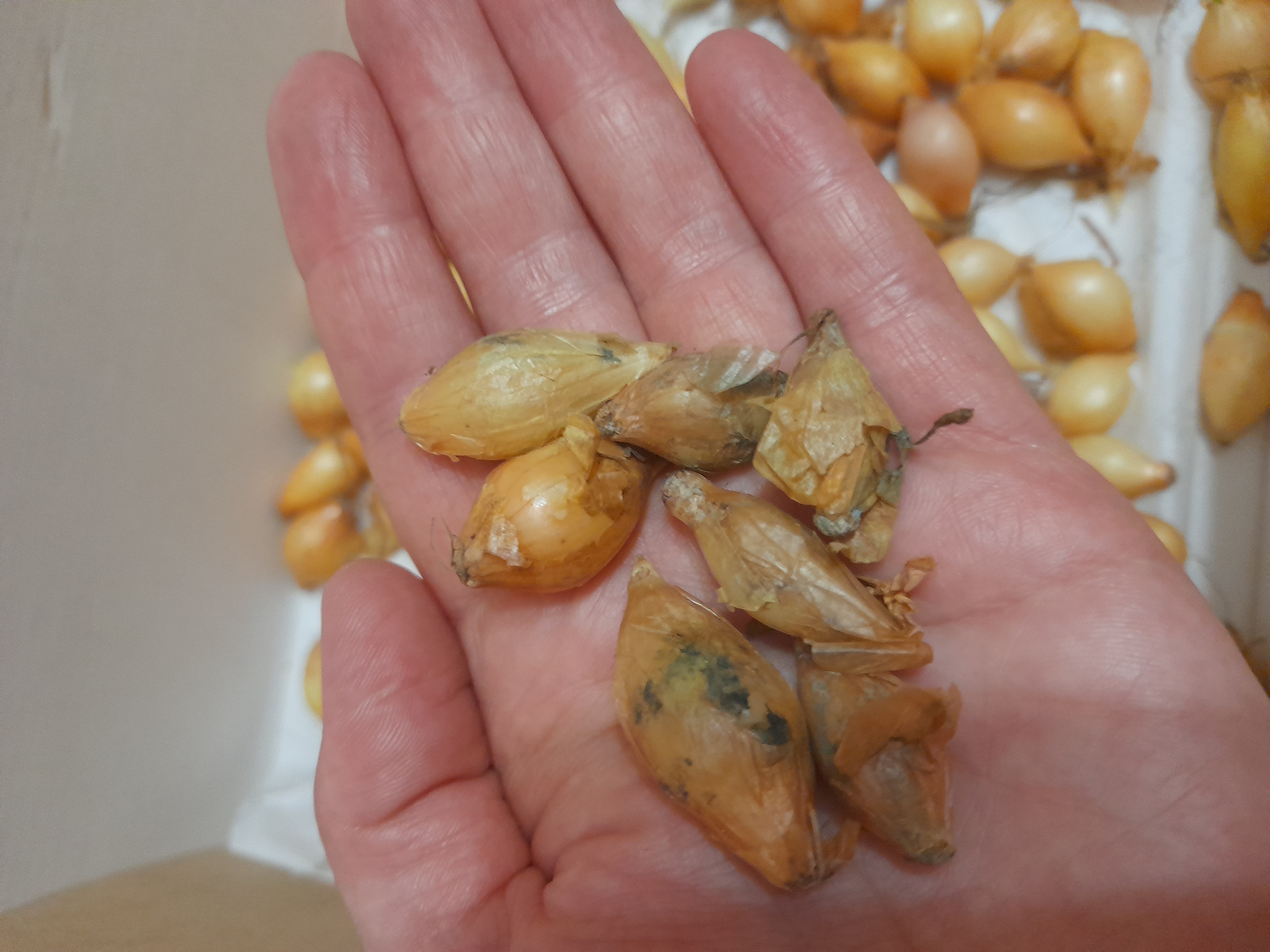 Крупноват для осенней посадуи. Чистый. Несколько гнилых луковок