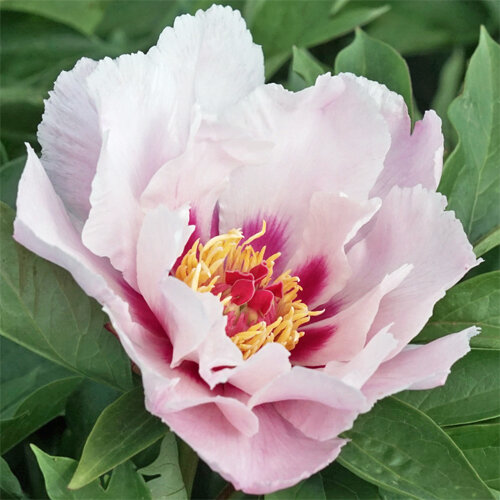 Происхождение: Martha W. x неизвестно. Впервые расцвел в 2012 году; впервые распространен в 2013 году. Peekaboo Flash пион с простой формой цветка. Один цветок на стебель, размером 6-7 дюймов (15-18 см). Светло-розовые лепестки, обычно округлые, края неглубоко зазубренные. По мере старения цветка лепестки начинают бледнеть до белого цвета. Фиолетовые вспышки простираются примерно на четверть длины лепестков. В среднем 5 зеленых плодолистиков, умеренно волосатых, увенчанных розовыми рыльцами нормальной анатомии. Тычинки лишены пыльцы, нити розовые у основания, желтые у кончика. Без семян. Оболочка розовая, полная. Ароматный. Молодая листва бордовая, потом становится зеленой. Высота до 26-28 дюймов (66-71 см), вертикальный рост.