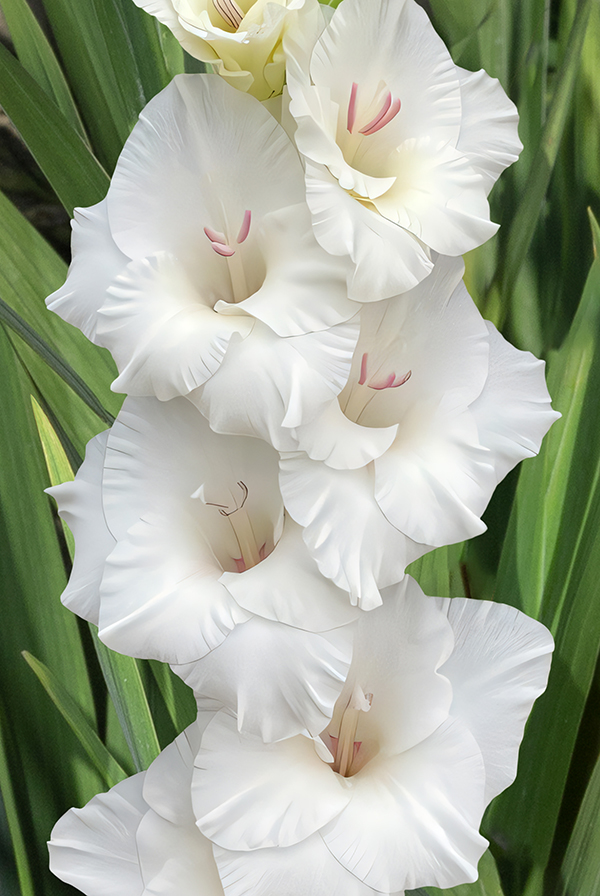 Мелкоцветковый гладиолус с обворожительными соцветиями. Особенностью этого сорта является его белоснежные цветы, которые имеют небольшие оттенки белого цвета. Цветение гладиолуса имеет однородное распределение цвета и за счет этого выглядит особенно эффектно.