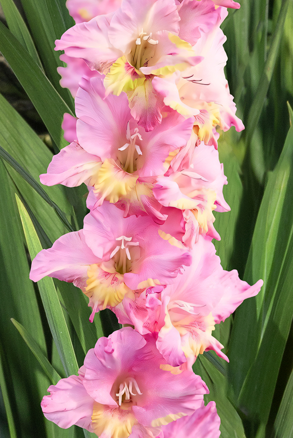 Великолепный гофрированнный сорт с ярким и ослепительным цветением. На цветоносе образуется колосовидное соцветие. Оно состоит из крупно-треугольных цветков. Основная окраска розовый с жёлтым с высветлением в горле, с малиновыми пятнами на лепестках. Сорт великолепно смотрится в срезке и украсит любой букет своим ярким внешним видом.