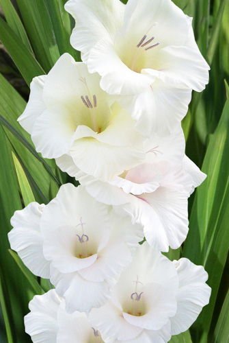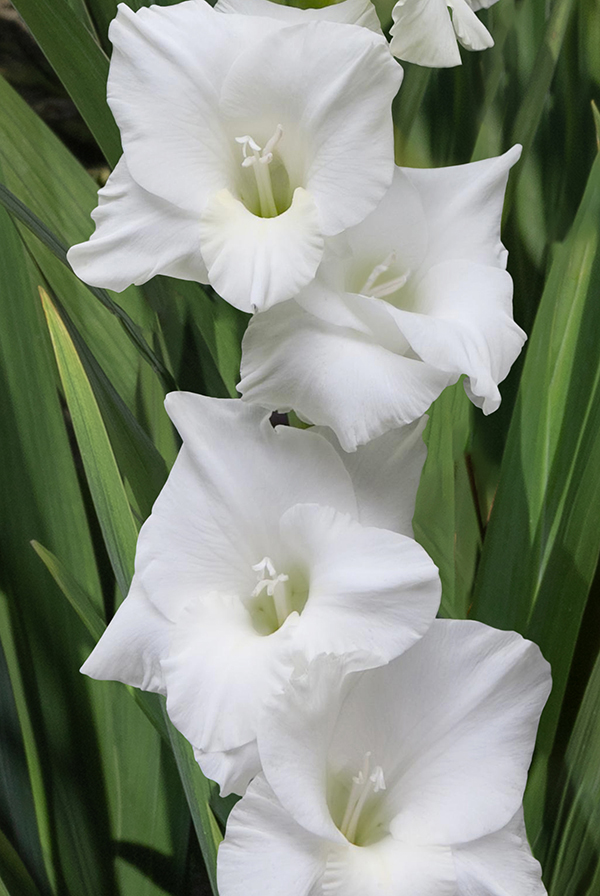 Элегантный крупноцветковый гладиолус незаменимо будет смотреться в любом уголке сада, внося средь знойного лета прохладные нотки эффектного цветения. Сорт образует роскошные, белоснежные цветы с кремовым отблеском у основания, край лепестков сильно гофрированный. Цветы треугольной формы, при роспуске диаметром 12-14 см.