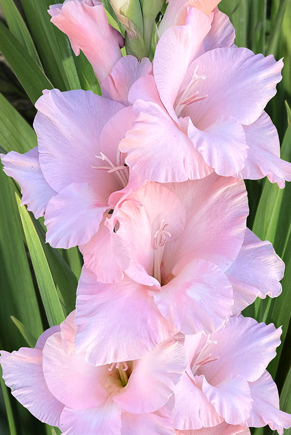 Прекрасный гладиолус пастельных тонов. Нежно-розовые цветы с пышной гофрированной кромкой лепестков. Гладиолусы идеально подходят для групповых посадок или вплетения в клумбы. Отлично подходит для срезки.