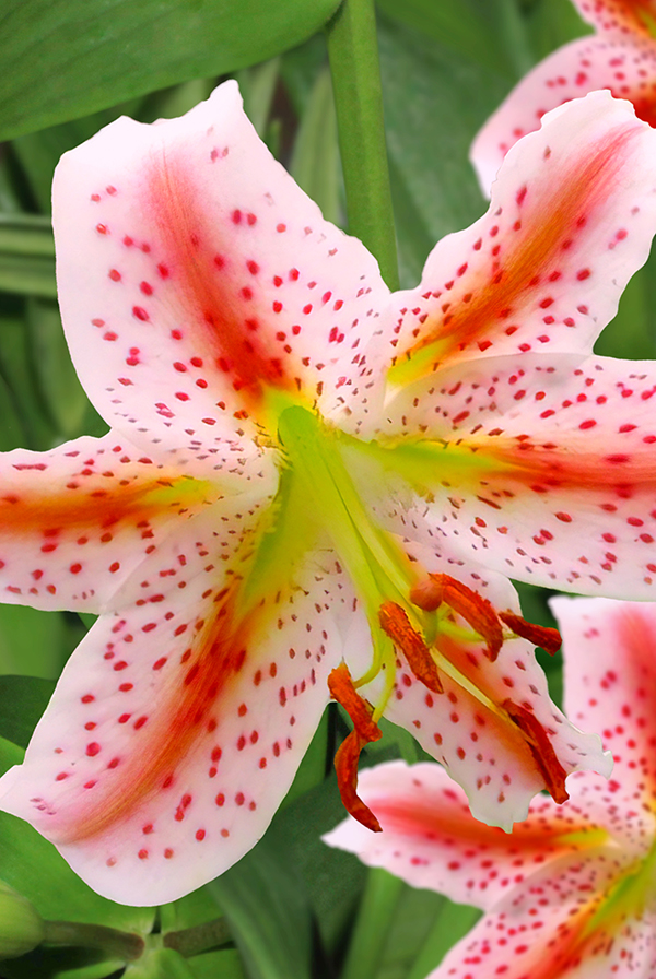 Великолепный сорт с очень крупными цветками. Окрас белый с оранжево-розовыми полосами, также по всему цветку можно заметить розовый крап. Очень хороша в качестве срезанного цветка в вазе. Они будут смотреться великолепно и в саду, и в букете.