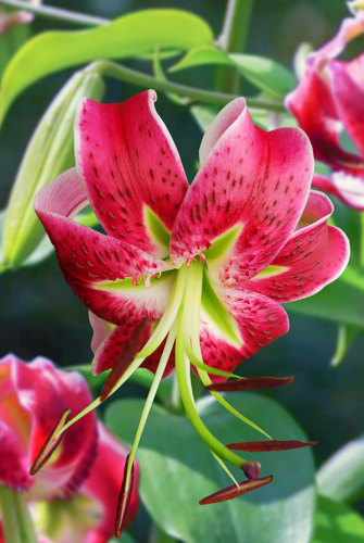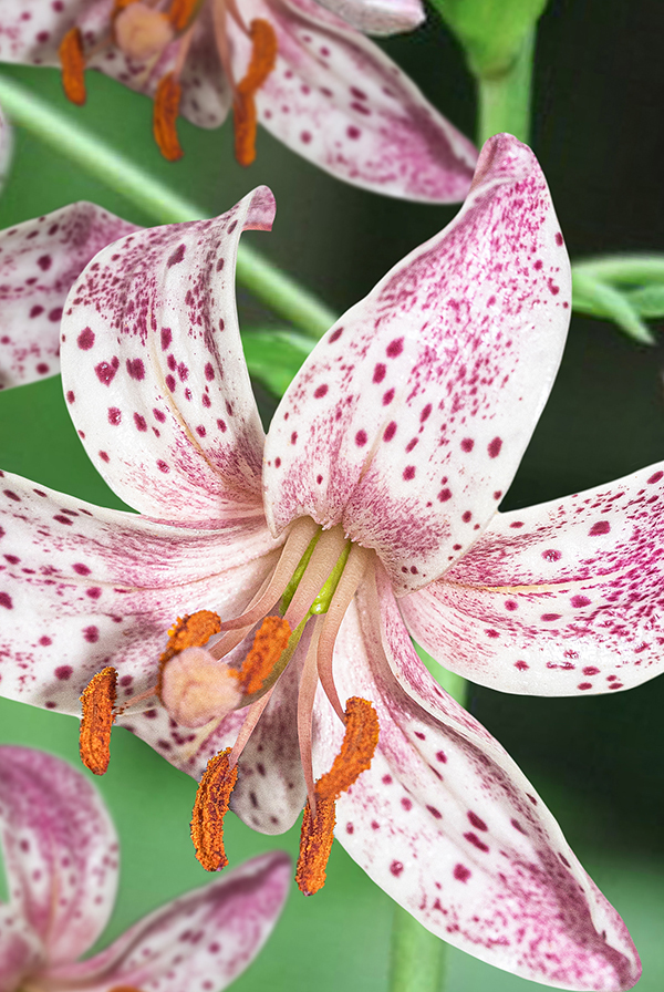 Лилия Пинк Морнинг напоминает настоящую француженку. Она такая же нежная и изысканная, романтичная и стильная. В ее облике просматриваются далекие аристократические корни. Изящно изогнутые лепестки устремляют свои кончики вверх, тогда как бело-сиреневая середина цветков никогда не увидит неба. Соцветия, состоящие из 5-6 одновременно раскрывающихся бутонов, смотрят вниз, оценивая стройность цветоносов и степень их облиственности. Сорт не может похвастаться броской раскраской, его фишка – спокойное и благородное сочетание розовых, сиреневых и белых оттенков. Основной окрас лепестков – молочный белый. Но он практически не виден под густым сиренево-розовым крапом.