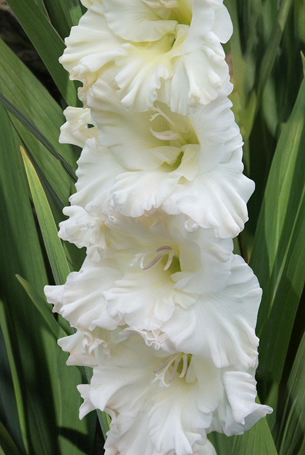 Один из самых популярных сортов садовых гладиолусов. Стебли прямые, гибкие, с длинными цветоносами на верхушках. Мощный гигант с великолепно гофрированными кипельно-белыми цветками, если присмотреться, то можно заметить сливочно-желтое напыление. В жаркую погоду цветки могут приобретать слегка кремовый оттенок.