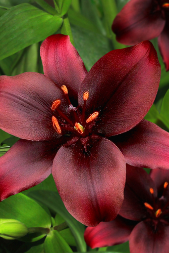 Красивый цветок широкочашевидной формы. Бутоны направлены вверх, способны достигать диаметра 16 см. Лепестки крупные, с белым центром и пурпурно-малиновыми кончиками, с мелкими пурпурно-красными пятнышками. Тычиночные нити белые, пыльца оранжевая, рыльце темно-красное.