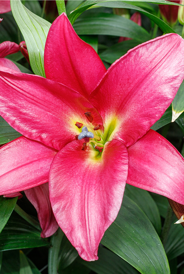 Высокорослый, крупноцветковый сорт. Лепестки изящно изогнутые, они окрашены в пурпурно-фиолетовые оттенки. В центре можно заметить оранжево-коричневые пыльники.