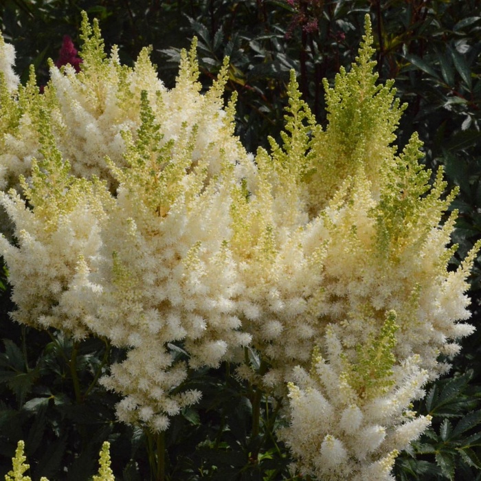 Астильба – оригинальное декоративное растение. Наиболее эффектны астильбы во время цветения. Их нежные соцветия не теряют привлекательности в течение 25-35 дней. Своими красками и формами эти растения оживляют светло-тенистые места в саду. Благодаря большому выбору сортов можно наблюдать сменяющие друг друга перистые метелки с июня по сентябрь. Соцветия могут быть пирамидальными, ромбическими, метельчатыми, но особенно изящны поникающие. Декоративность соцветий зависит от их плотности. Мелкие цветочки собраны в удлиненные метелки. Характер куста кустовидный, от прямого до раскидистого.Посадка: все астильбы влаголюбивы, зимостойки, устойчивы к вредителям и болезням. хорошо растут в светлом и полутенистом, прохладном месте, с влажным воздухом. Большинство сортов может расти в местах с довольно высокими грунтовыми водами и переносит даже застой воды. Почвы предпочитает хорошо удобренные. Важно, чтобы в корнеобитаемом слое почвы хватало фосфора и калия. Не переносит мест с сухим воздухом. Очень восприимчива к жаре!Уход: для поддержания декоративности растений следует ежегодно заботится об удобрении. Подкармливают астильбы сначала весной (азотные удобрения), потом сразу после цветения или осенью (калием и фосфором- 20-25 г на одно растение). На одном месте могут расти долго, до 15-20 лет.Использование: астильбы — прекрасные растения для озеленения. Их можно высаживать моногруппами вблизи кустарников. А одиночные вкрапления этих растений выглядят особенно элегантно среди посадок декоративных хвойных. Лучше всего чувствуют себя у водоемов или во влажных полутенистых местах. Уайтберри – высота растения 30 см. Цветки белоснежные, в компактных соцветиях. Цветение обильное.