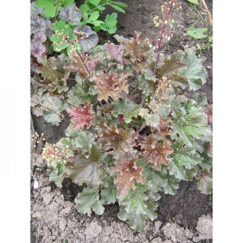 Листья гейхеры имеют уникальный окрас — теплые коричневые и золотистые оттенки, которые напоминают цвет капучино, что придает растению особую декоративность в любое время года. Цветки мелкие, кремово-белые, собраны в пышные метелки, которые распускаются в период с конца весны до середины лета, создавая живую атмосферу в саду.