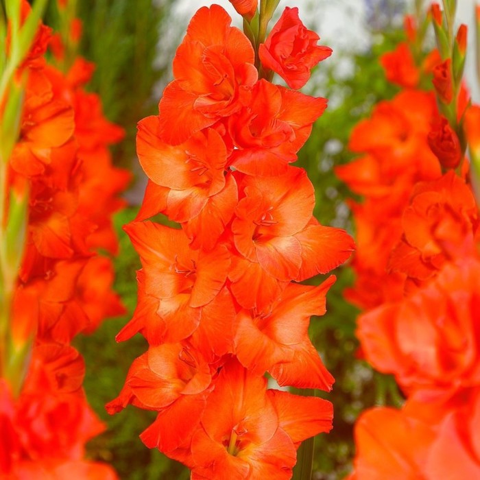 Гладиолус крупноцветковый "Лайв Оук" - это высокорослый сорт с яркими оранжево-красными соцветиями. Его насыщенный цвет создает мощный, теплый акцент на солнечной клумбе.