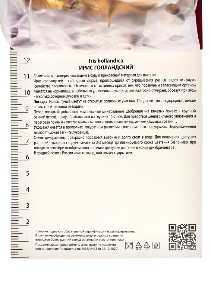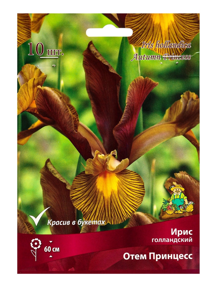 Ирис голландский - гибридная форма, произошедшая от скрещивания разных видов ксифиума (семейства Касатиковых). Отличаются от истинных ирисов тем, что подземным запасающим органом является не корневище, а небольшая удлиненная луковица; она ежегодно отмирает, образуя при этом несколько дочерних луковиц и детки.Отем Принцесс - высота растения 60 см. Красивый цветок теплых осенних оттенков. Лепестки кружевные, палево-коричневые с легкой золотистой дымкой и красным румянцем. Сигналят желтыми пятнами на нижних лепестках. Идеально подходит для срезки. Великолепно смотрится в цветниках.Местоположение: открытые солнечные участкиПочва: плодородные легкие почвы с нейтральной реакцией среды.Посадка: Перед посадкой добавляют комплексные минеральные удобрения (на тяжелых почвах – крупный речной песок), почву обрабатывают на глубину 15-20 см. Луковицы высаживают в подготовленные лунки, заглубляя на 5-10 см. Посадки мульчируют, используя песок или мелкий гравий.Уход заключается в прополках, аккуратном рыхлении, своевременных подкормках. Ирисы не любят переувлажнения (может загнить луковица).Использование: Очень декоративны в миксбордерах, группами на фоне газона. Прекрасно поддаются выгонке и долго стоят в воде. Для получения цветущих растений луковицы следует сажать за 2-3 месяца до планируемого срока цветения (например, при посадке в сентябре-октябре можно получить цветущее растение в конце декабря-январе).