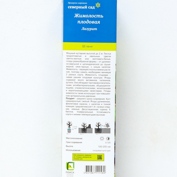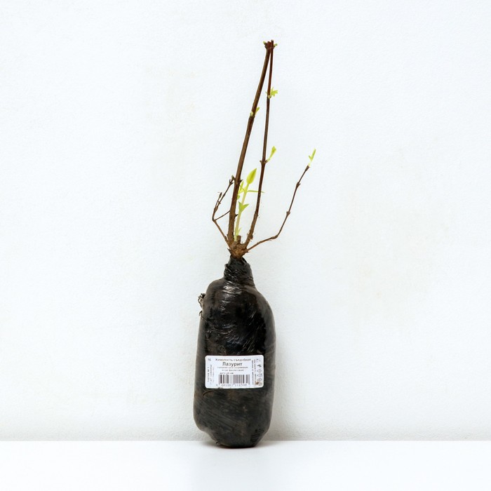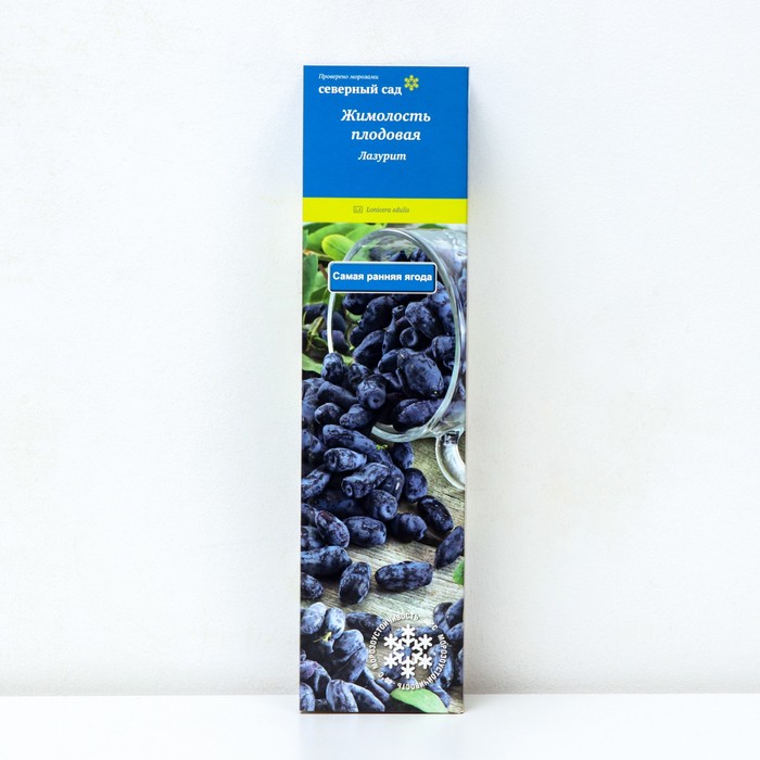 Жимолость съедобная Лазурит - листопадный плодовый кустарник до 170 см высотой. Куст сжатый. Плоды фиолетового цвета, удлиненной формы, длиной 20 мм, весом 1,3-2,1 г. Созревают в июне. Вкус плодов жимолости сладкий. Мякоть очень нежная. Урожайность 0,9-1,3 кг с куста. Сорт высокоустойчив к низким температурам, пригоден для технологической переработки. Ягоды универсального назначения. Саженцы жимолости продаются в разных видах упаковки с разным сроком реализации:  однолетний саженец жимолости в красочной упаковке с упакованной корневой системой в торфяную смесь - прием заказов осуществляется с октября по апрель, доставка с марта по май; саженец в контейнере 2-5 литров с закрытой корневой системой - прием и доставка заказов осуществляется с мая по октябрь.  Высота саженца жимолости в контейнере 2 литра - 20-40 см; Высота саженца жимолости в контейнере 5 литров - 40-60 см.