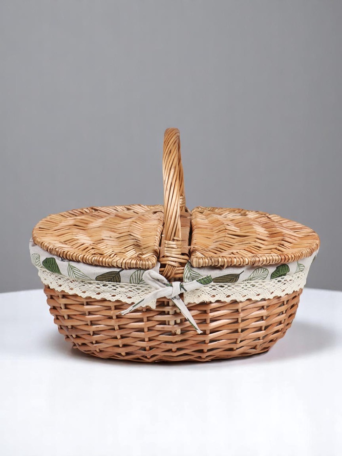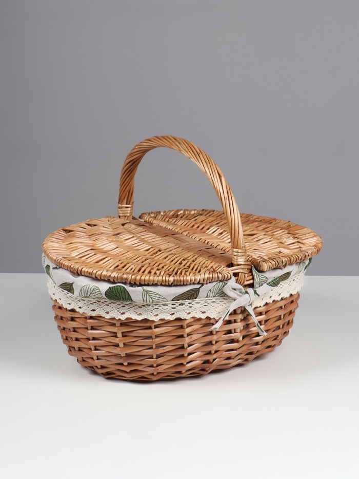 Плетёная корзина-лукошко, ткань внутри, 2 крышки, 35×28 см, высота 14.5 см, высота с ручкой 31 см, дно