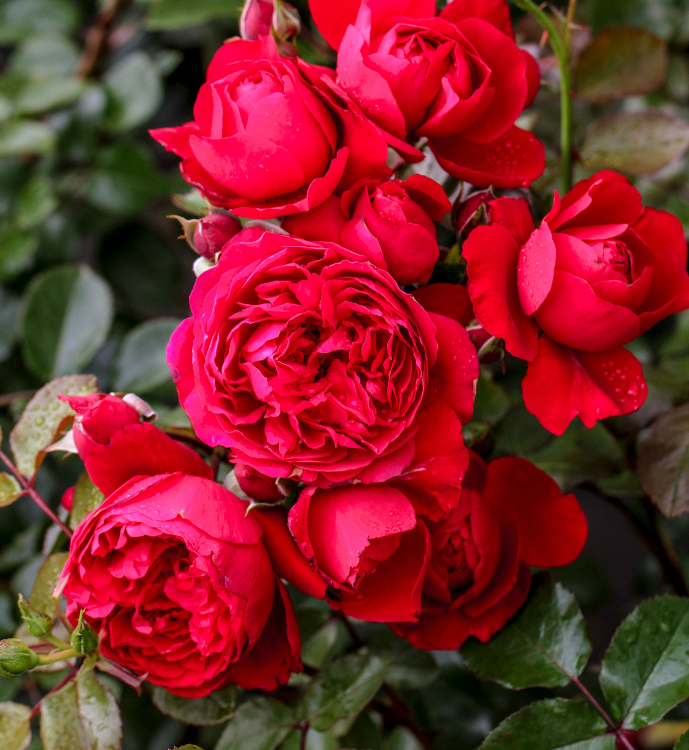 Ярко-красные цветки с желтым глазком, розетковидной формы, густомахровые (26 - 40 лепестков), обладают легким фруктово-цветочным ароматом.