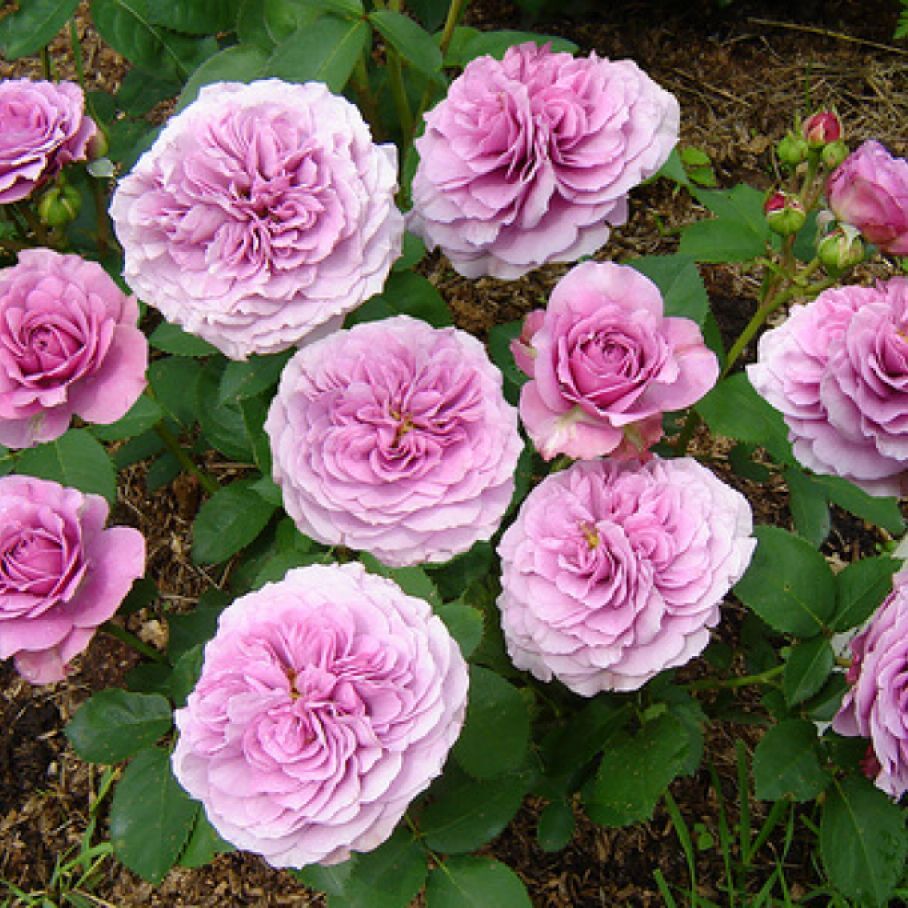 Цветки сорта полностью оправдывают его название. Нежные сиреневые оттенки лепестков отливают голубым серебром, что действительно создает впечатление «лавандового льда». Расцветка у лепестков яркая, в период цветения кусты весьма декоративны. Средние по габаритам цветы обладают розетковидной формой, насчитывают от 26 до 40 лепестков, что дает право отнести их к среднемахровым.