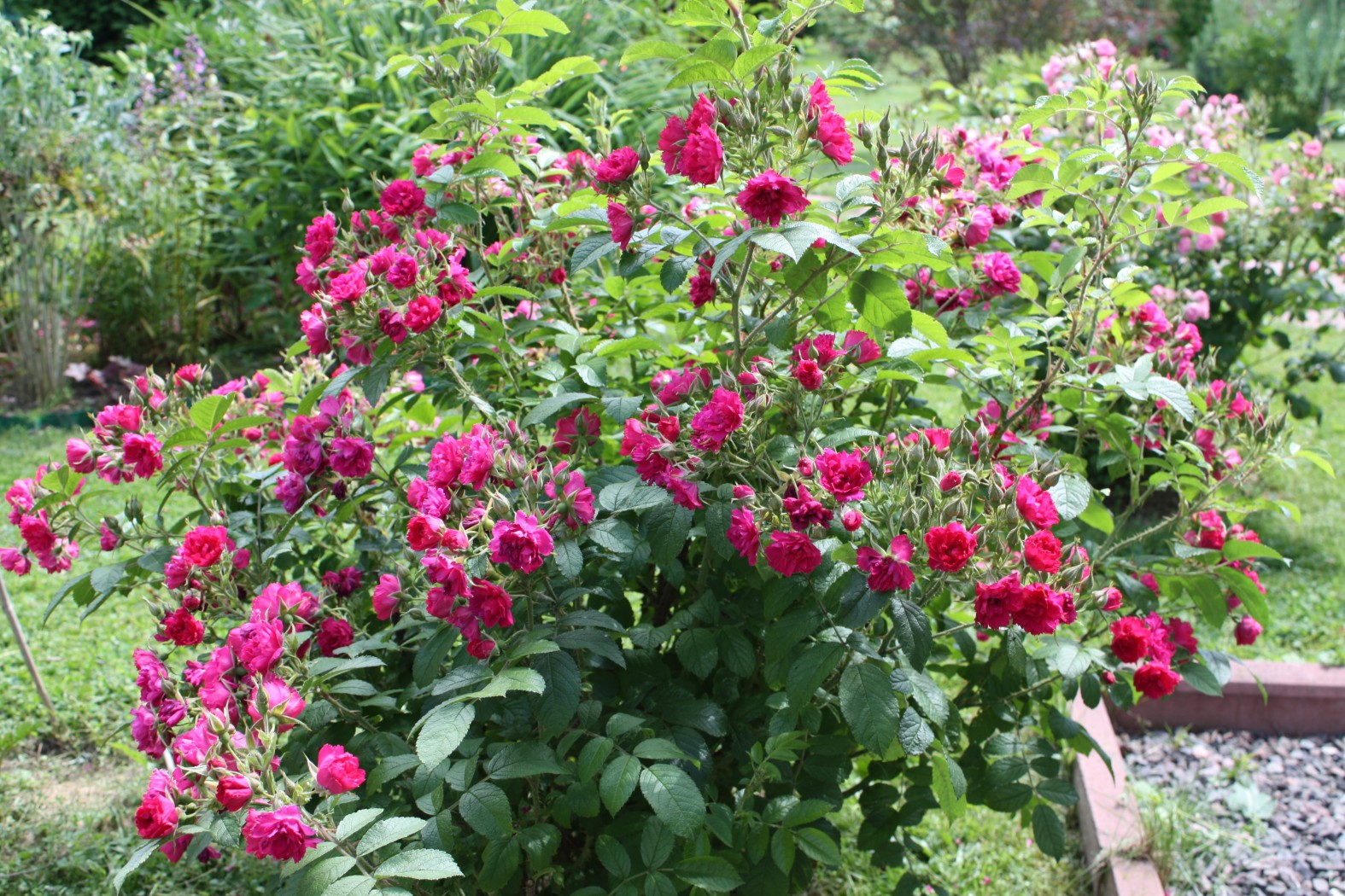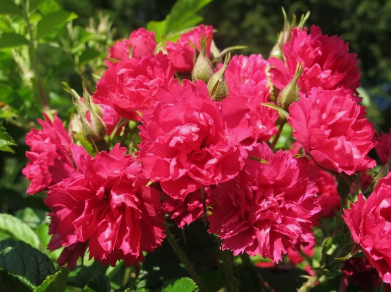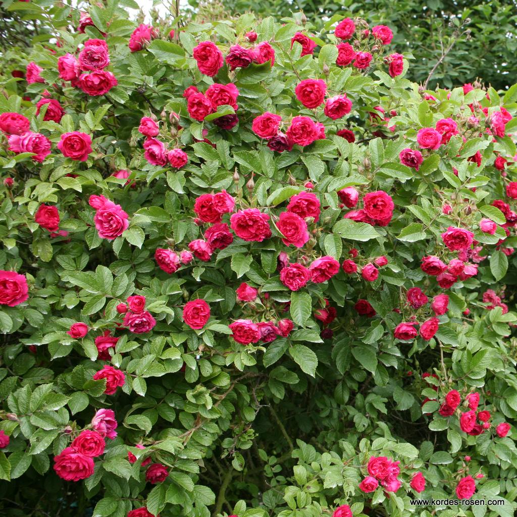 Роза Ругоза 'F.J.Grootendorst' цветет крупными кистями мелких цветков, напоминающих гвоздики, очень обильно. Куст сильнорослый. Темно-зеленая, кожистая и очень колючая листва характерна для ругозы, она оттеняется кистями мелких, малиново-красных цветочков, с изрезанными краями, как у гвоздики. Цветки мелкие (4 см), махровые, карминово-красные, собраны в соцветия. Без запаха. Хорош в живой изгороди, достигает 1,5 м в высоту. Цветет обильно. Можно обрезать до любой желаемой высоты. Выносливый сорт. Можно выращивать в полутени. Быстро зацветает повторно.