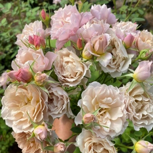 Спрей. Кустик среднерослый (не более 80см), с узковатой кроной (в обхвате до 55см) и гибкими, хлесткими побегами. Листва глянцевая, мелкая, сердцевидная с тонким кончиком, насыщенно болотная с чуть осветленными краями. Бутон немного кудрявый, с нежными волнистыми лепестками, бокаловидный, диаметр – 8-8,5см, на стеблях – по 6-10 цветков. Окраска розы – элегантная кофейно-лососевая с сиреневыми и кремовыми переливами и почти белыми верхушками на лепестках. Аромата практически нет. Цветет не пышно, зато по-азиатски неспешно. В букете роза простоит 12 суток. Сорт поражает зрителя в первую очередь необычностью и богатством оттенков его бутонов.