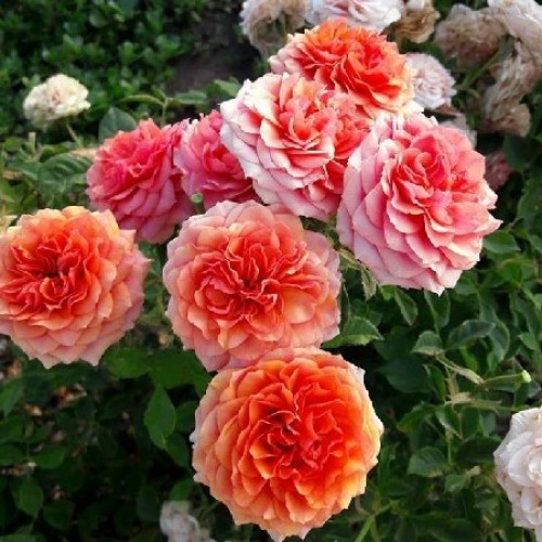Спрей. Роза с розово-персиковыми некрупными, до 5-7см в диаметре, густомахровыми (45-50 лепестков) цветами. По мере роспуска цветок показывает лососевые тона. Бутоны появляются в кистях по 3-5 штук, долго держатся на цветоносах, сохраняя цветовую гамму. Цветение обильное, повторное до поздней осени. Аромат легкий, с нотками чая. Куст компактный, среднерослый, крепкий. Высота куста 60-70см, ширина 40-50см. Листва темно-зеленая, блестящая, имеет хорошую стойкость к грибковым заболеваниям. Морозостойкость сорта высокая. Повторноцветущая._x000D__x000D_Поставка: весна 2026г.