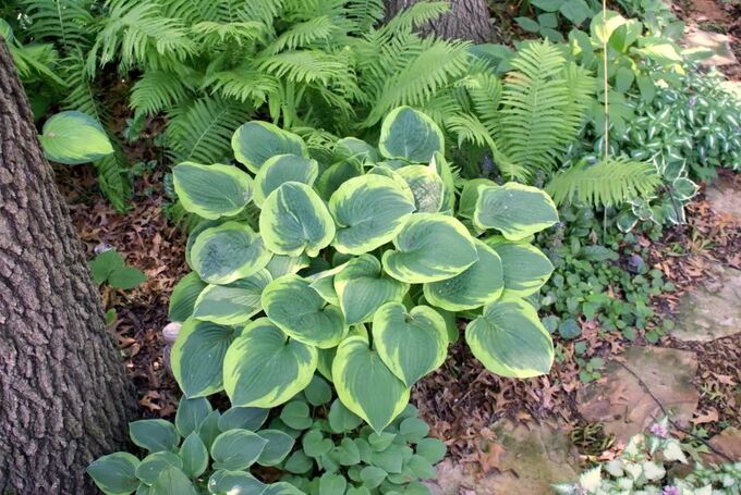 Зеленые листья с жёлтым краем. Хоста "Abiqua Moonbeam" крупная, имеет бледно-лавандовые цветы, и растет на солнце и тени. Высота от 60 до 70 см, отличные ростовые качества. Листья хосты плотные, с выраженными морщинистостью (особенно у взрослых растений) и жилкованием.
