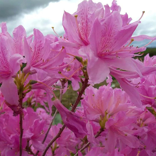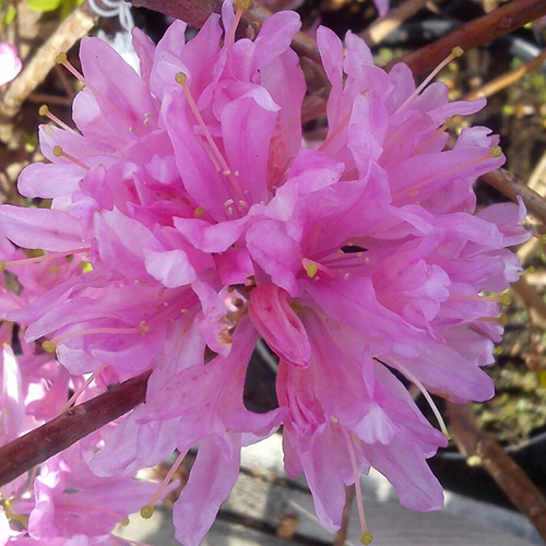 Низкорослый декоративный кустарник с крупными цветками насыщенного розового окраса и плотной зеленой листвой с легким синеватым оттенком. Листья крупные, продолговато-яйцевидной формы, тёмно-зелёного цвета. Цветки крупные насыщенного розового окраса. Интенсивность окраса нарастает ближе к центру цветков, а края лепестков имеют более нежный оттенок. Цветки собраны в густые шарообразные соцветия. Зацветает в мае, цветёт очень обильно.